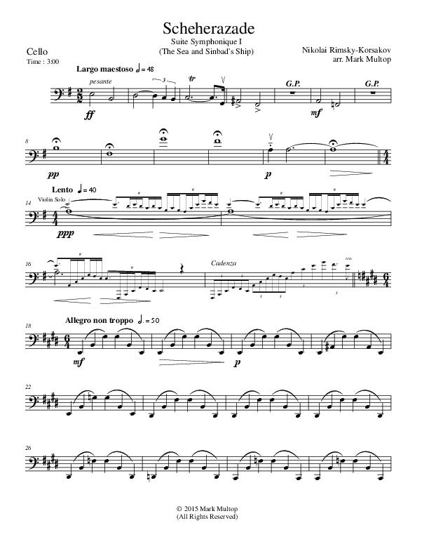 This string arrangement by Mark Multop was written to capture all the elements of Rimsky Korsakov’s Scheherazade, staying true to the original composition while reducing the difficulty level to advanced intermediate (advanced high school). All 4 movements (each sold separately) include violin solos. The second movement features beautiful cello solos as well.Each title includes: Score, Violin I, Violin II, Viola, Cello, Bass, Violin III (doubles viola), and Cello II (doubles viola).